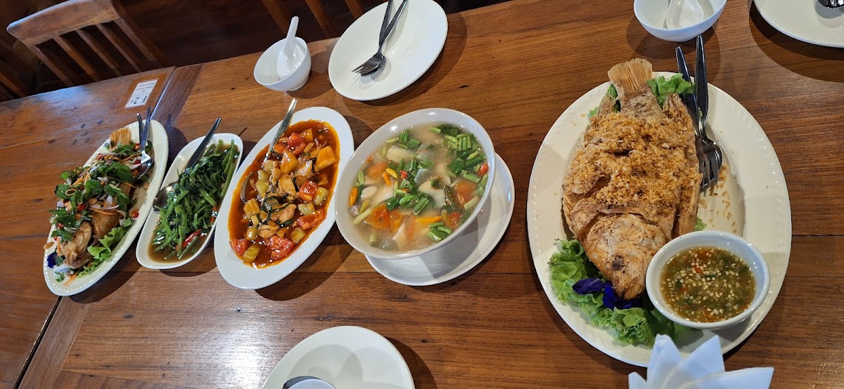 The food was good. When ordering they paid attention to our preference of having less spicy food. The fried fish with herbs was deliciously fresh. Nice ambience. Easy parking
